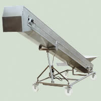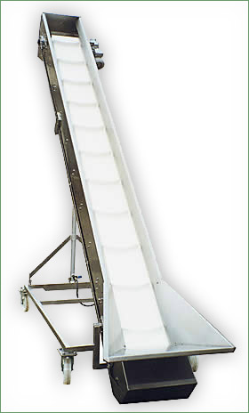 Aufgabetrichter mit besonders niedriger Einfüllkante. Seitenleisten, Aufgabetrichter und Auffangwanne sind zu Reinigungszwecken leicht abnehmbar. Fördergurt in lebensmittelbeständiger Qualität (FDA-geprüft) mit U-förmig aufgeschweißten Mitnehmerprofilen, dadurch besonders schonender Transport des Lesegutes. Antrieb über abwurfseitig angeordneten Schneckengetriebemotor (als Option stufenlos regelbare Gurtgeschwindigkeit über Frequenzumrichter).