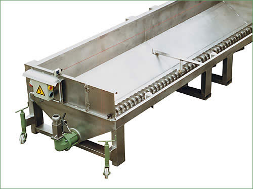 Die Trauben-Annahmewanne gibt es in Wannenlängen bis zu 6,00 m, mit Austragschnecken, Flügel-Ø 200 mm und 300 mm, Exzenterschneckenpumpen P 80 und P 100 sowie individuellen Höhen der Einfüllkante. Antrieb über Stirnradgetriebemotor bzw. Regelgetriebemotor. |