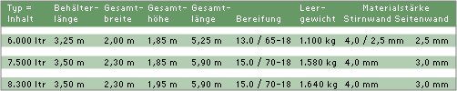 Behälterstirnseiten 4,0/2,5 mm dick, Behälterseitenwände 2,5 mm dick bis Typ SP 6000 bei Typ SP 7500/8300 Behälterstirnseiten 4,0 mm dick, Behälterseitenwände 3,0 mm dick.